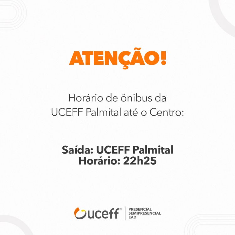 A Auto Viação Chapecó comunicou que disponibilizou um horário de ônibus às 22h25min, para atender aos estudantes da UCEFF Palmital. O transporte sai do ponto de ônibus em frente a UCEFF Palmital em direção ao terminal urbano de Chapecó. O ônibus está identificado como Quedas do Palmital. Esse é o último horário de ônibus do bairro para o Centro, os estudantes que dependem do transporte coletivo devem ficar atentos ao horário.