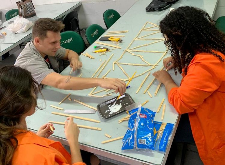 Os acadêmicos do 8º período de Arquitetura e Urbanismo da UCEFF Chapecó realizaram uma aula prática para construir pontes com palitos de picolé. A atividade integrou a disciplina de Sistemas Estruturais II - Aço e Madeira, ministrada pelo professor Rafael de Medeiros.