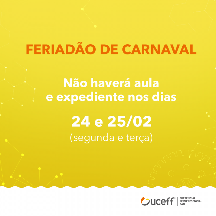 A UCEFF informa que, na segunda e terça-feira de Carnaval, dias 24 e 25 de fevereiro, não haverá aula e expediente.