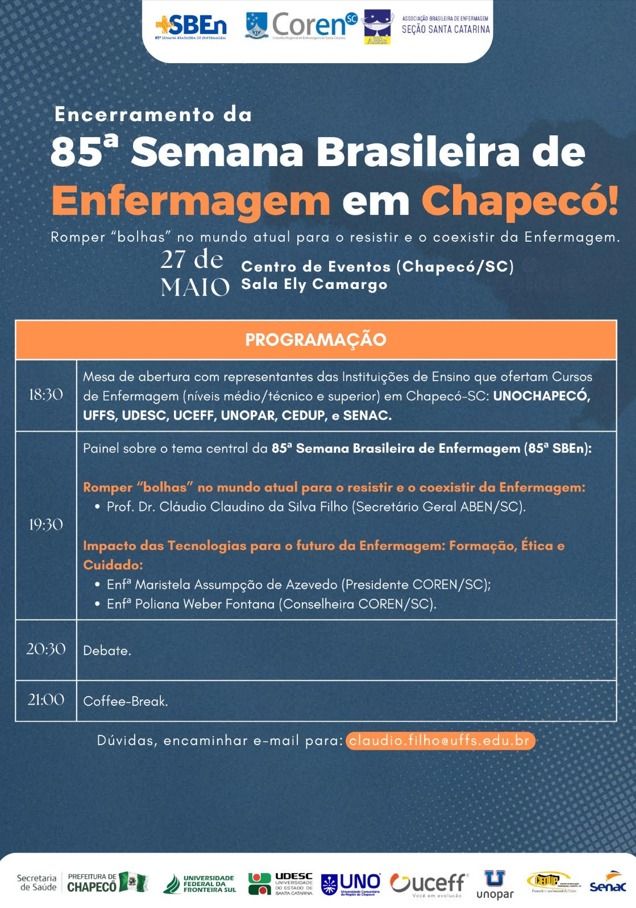 Oportunizar a participação de docentes e acadêmicos em evento de âmbito nacional. Esse foi o intuito do curso de Enfermagem da UCEFF que marcou presença no encerramento da 85º Semana Brasileira de Enfermagem, evento promovido pela Associação Brasileira de Enfermagem Nacional (ABEn) e que foi realizado no último dia 27, no Centro de Eventos Plínio Arlindo de Nês em Chapecó.