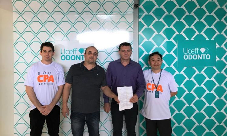Na foto: Adriano Vieira, diretor Administrativo da UCEFF, Marcos Vencatto, cirurgião-dentista, Nédio Tomazzi, secretário de Saúde de Caxambu do Sul, e Marcos Takemoto, coordenador de Odontologia