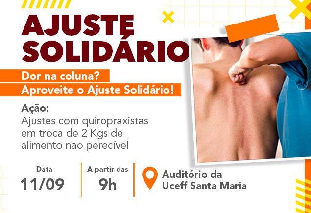 O poder da solidariedade transmitido pelo toque é o que motiva os quiropraxista pelo “Ajuste Solidário”, uma campanha que busca melhorar a qualidade de vida das pessoas. O curso de Quiropraxia da UCEFF, na busca de contribuir com a comunidade chapecoense, promove no próximo sábado (11) o “Ajuste Solidário”. A ação ocorre no auditório da UCEFF no bairro Santa Maria. A atividade busca atender pessoas da comunidade que tenham algum tipo de dor nas costas ou desconforto, o atendimento será realizado por profissionais quiropraxistas. Quem tiver interesse em participar precisa se inscrever e contribuir com dois quilos de alimento não perecível.