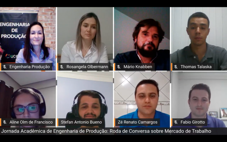O primeiro dia da Jornada Acadêmica de Engenharia de Produção ficou marcado pela Roda de Conversa: Mercado de Trabalho, dinâmica que propôs mostrar aos estudantes o que pode vir logo depois da faculdade. Os convidados foram egressos da UCEFF que trabalham em diversas áreas diferentes que abrangem a Engenharia da Produção. Foram eles: Fabio Girotto, José Renato Camargo, Mario Cesar Knabben Junior, Rosângela Olbermann e Thomas Talaska.