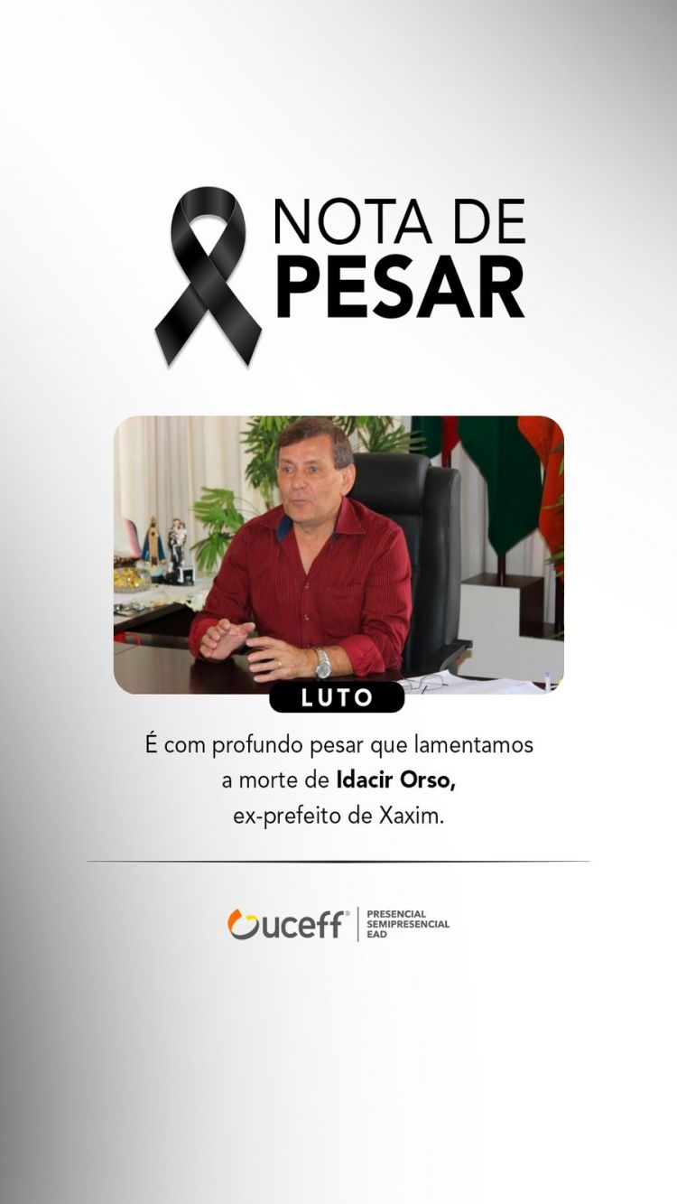 É com grande pesar que a UCEFF informa o falecimento do ex-prefeito de Xaxim, Idacir Antônio Orso, aos 70 anos, nesta terça-feira (05). Ele estava internado no hospital da Unimed em Chapecó.