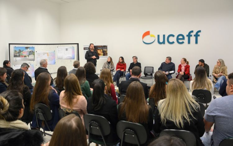 Na cerimônia, membros da comissão avaliadora entregaram os troféus aos arquitetos e urbanistas vencedores, Alencar Henrique Sordi e Emmanuelle Grossi Sembler - egressos da UCEFF, que idealizaram o projeto “Complexo Angatu”.