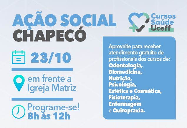 No sábado, dia 20 de novembro, a praça Coronel Bertaso recebe uma ação de promoção e cuidado com a saúde dos chapecoenses. Os cursos da área da saúde da UCEFF estarão realizando uma série de atendimentos e orientações referentes a diversos cuidados com o corpo e a mente. Estarão presentes na ação os cursos de Biomedicina, Enfermagem, Estética e Cosmética, Fisioterapia, Nutrição, Odontologia, Psicologia e Quiropraxia. A atividade inicia às 8h e se estende até às 12h, com intervenções na praça e também com Drive Thru, para poder atender e orientar a população que passar pelo local.