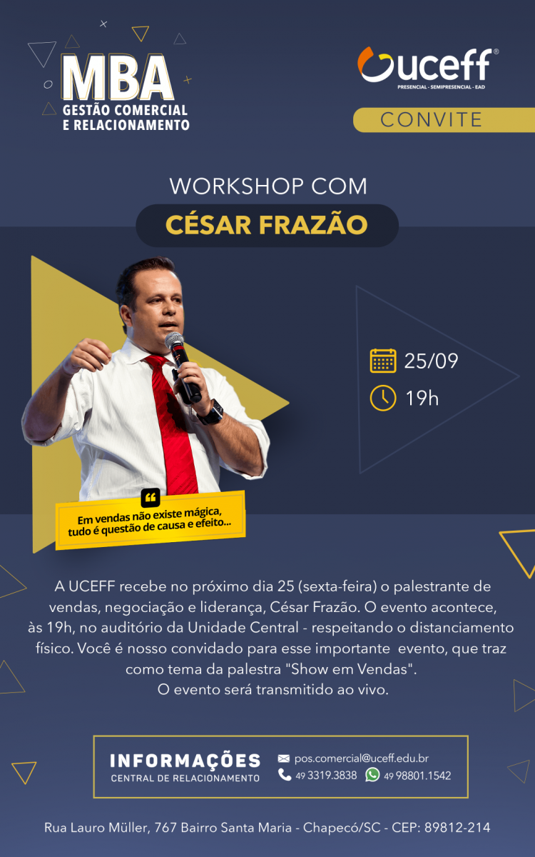 Na próxima sexta-feira (25), a partir das 19h, a UCEFF Chapecó irá promover um evento para a Pós-Graduação em Gestão Comercial e Relacionamento com o convidado César Frazão no auditório da unidade Santa Maria. Palestrante, escritor e consultor, sua palestra “Show em Vendas” é a mais assistida do setor do Brasil nos últimos anos. O conteúdo da fala consiste em treinamento com as melhores técnicas de vendas do mundo.