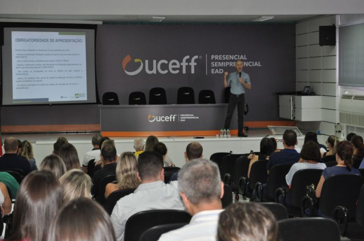 Na manhã desta quinta-feira (12), o auditório da UCEFF foi palco da palestra IRPF 2020: principais alterações e novidades, realizada pelos auditores fiscais da Receita Federal Sérgio Garbin e Marcelo Holstak. O evento foi promovido pelo Núcleo de Estudos Contábeis de Chapecó (NECC) do Sindicato dos Contabilistas de Chapecó (Sindicont) e teve acesso gratuito. Na oportunidade, os auditores apresentaram novidades da declaração e esclareceram dúvidas.