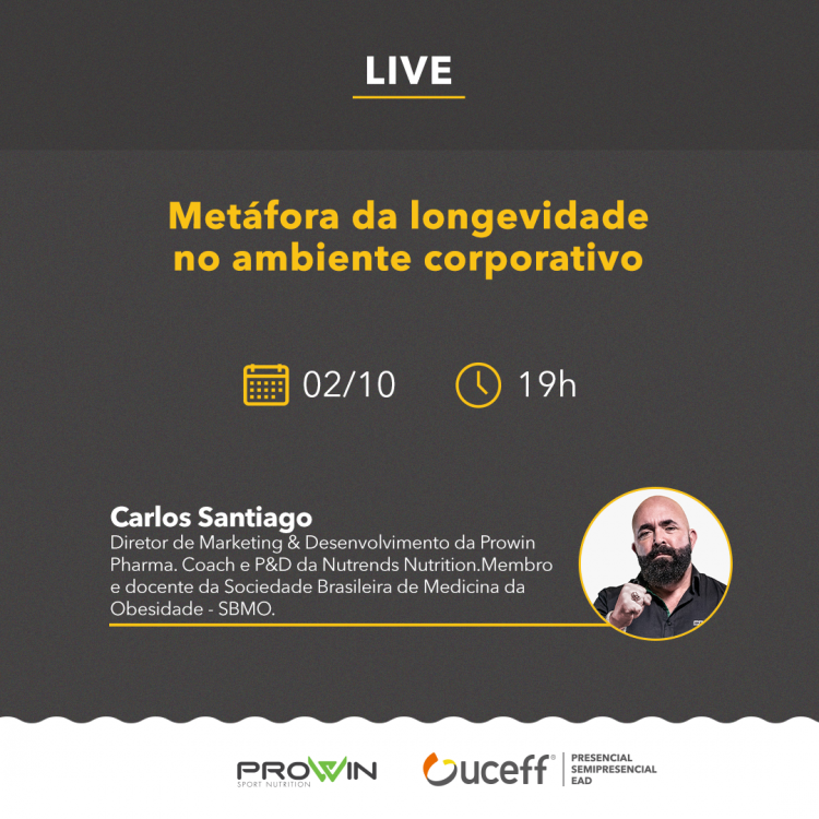 Carlos Santiago é Diretor de Marketing & Desenvolvimento da Prowin Pharma., além de trabalhar como Coach e P&D da Nutrends Nutrition. Também é membro e docente da Sociedade Brasileira de Medicina da Obesidade - SBMO. Santiago falou sobre o tema da palestra: "Vamos abordar alguns aspectos que falam sobre como o homem pode ser longevo e o que ele tem que fazer para ser nesse momento de reclusão, de pandemia, onde todas as atividades se encaminham para a reclusão. A era digital faz hoje com que você consiga trabalhar, comer, dormir, tudo praticamente no mesmo ambiente. O homem cada vez se movimentando menos fez a gente evoluir como espécie. Então... como conciliar a minha saúde mental com a minha saúde física e, acima de tudo, com a minha saúde emocional?".