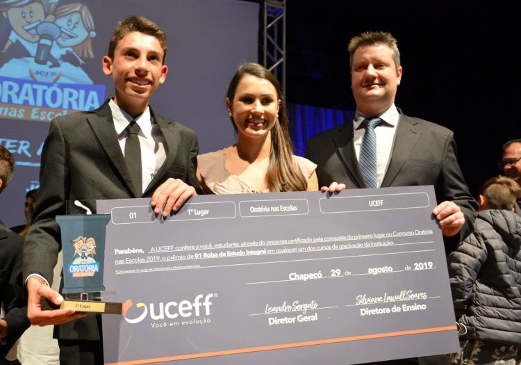 Pelo sexto ano consecutivo, a UCEFF Chapecó é a patrocinadora oficial do Oratória e oferece ao grande vencedor uma bolsa de estudos integral em um curso de graduação. Neste ano, o vencedor recebeu o cheque simbólico pelas mãos do professor Eduardo Destri Schwengber, coordenador do curso de Direito, que presentou o diretor geral na cerimônia de entrega. O jovem comenta que tão importante quanto a aprendizagem, durante a realização do Oratória nas Escolas, foi a oportunidade de saber que com foco e boas pessoas ele pode alcançar seus sonhos.