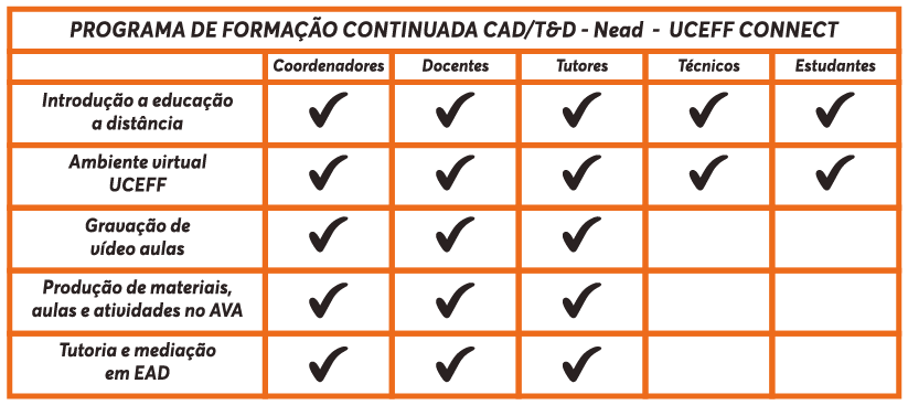 O NEaD, em parceria com o Centro de Aperfeiçoamento Docente (CAD), desenvolve formações específicas para atuação dos docentes, tutores, estudantes e técnicos administrativos na modalidade a distância.