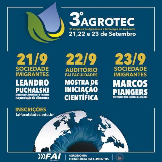 A palestra sobre mudanças climáticas e os impactos na produção de alimentos com Leandro Puchalski será no dia 21 de setembro no Clube Imigrantes. Já no dia seguinte (22/09) acontece, no auditório da FAI Faculdades (Sala 305 Bloco C), a Mostra de Iniciação Científica. E para encerrar o evento, na sexta-feira (23/09), palestra inovação: uma espiada no mundo com Marcos Piangers.