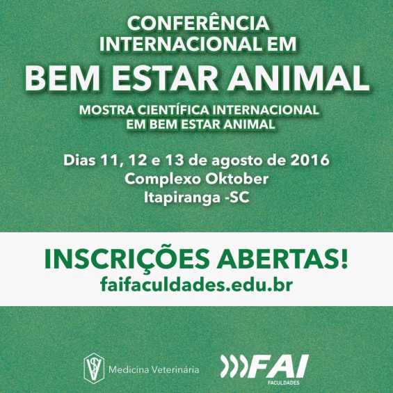 O curso de Medicina Veterinária da FAI Faculdades está organizando para os dias 11, 12 e 13 de agosto de 2016 a Conferência e Mostra Científica Internacional em Bem Estar Animal.