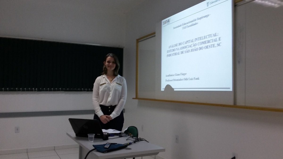 A acadêmica concluinte Aline Specht abordou \"A contabilidade de custos e aformação do preço de venda: estudo de caso de uma empresa de confecções do município de São João do Oeste; Giane Finger falou da \"Percepção dos gestores das empresas associadas sobre o capital intelectual: estudo na Associação Comercial e Industrial de São João do Oeste\"; Jackson Borck \"Teoria da contingência e contabilidade gerencial: estudo em empresas industriais do extremo oeste do estado de Santa Catarina\";Kelly Kuhn tratou a \"Análise de custos e apuração dos resultados das atividades econômicas-financeiras: o caso de uma propriedade rural; Micheli Dettenborn \"Os índices econômico-financeiros como instrumento de análise financeira das demonstrações contábeis de empresas do segmento de energia listadas na bm&fbovespa\"