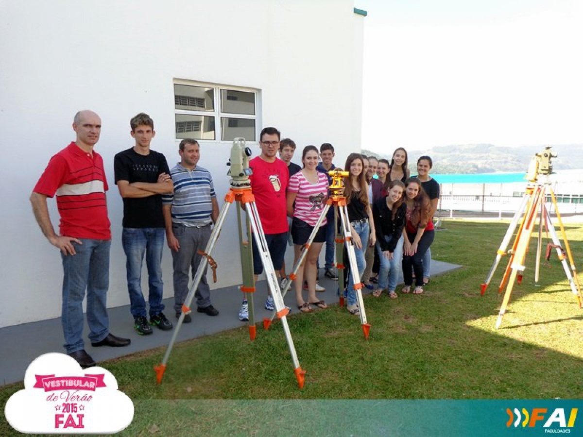 No último sábado (25/10) os acadêmicos do 2º semestre do curso de Matemática da FAI Faculdades tiveram a oportunidade de conhecer e explorar aplicações com Teodolitos de uso profissional. A aula foi uma complementação e comprovação de outras aulas práticas desenvolvidas durante a disciplina de Fundamentos de Matemática II, ministrada pela professora Lourdes Conci Griebeler. Nestas aulas, os alunos construíram “inclinômetros” e teodolitos artesanais, com os quais efetuaram medidas nos prédios da Instituição e no entorno da mesma, tendo como princípio básico, a medição de ângulos horizontais e verticais e, a partir de levantamento de dados, medir distâncias e alturas.