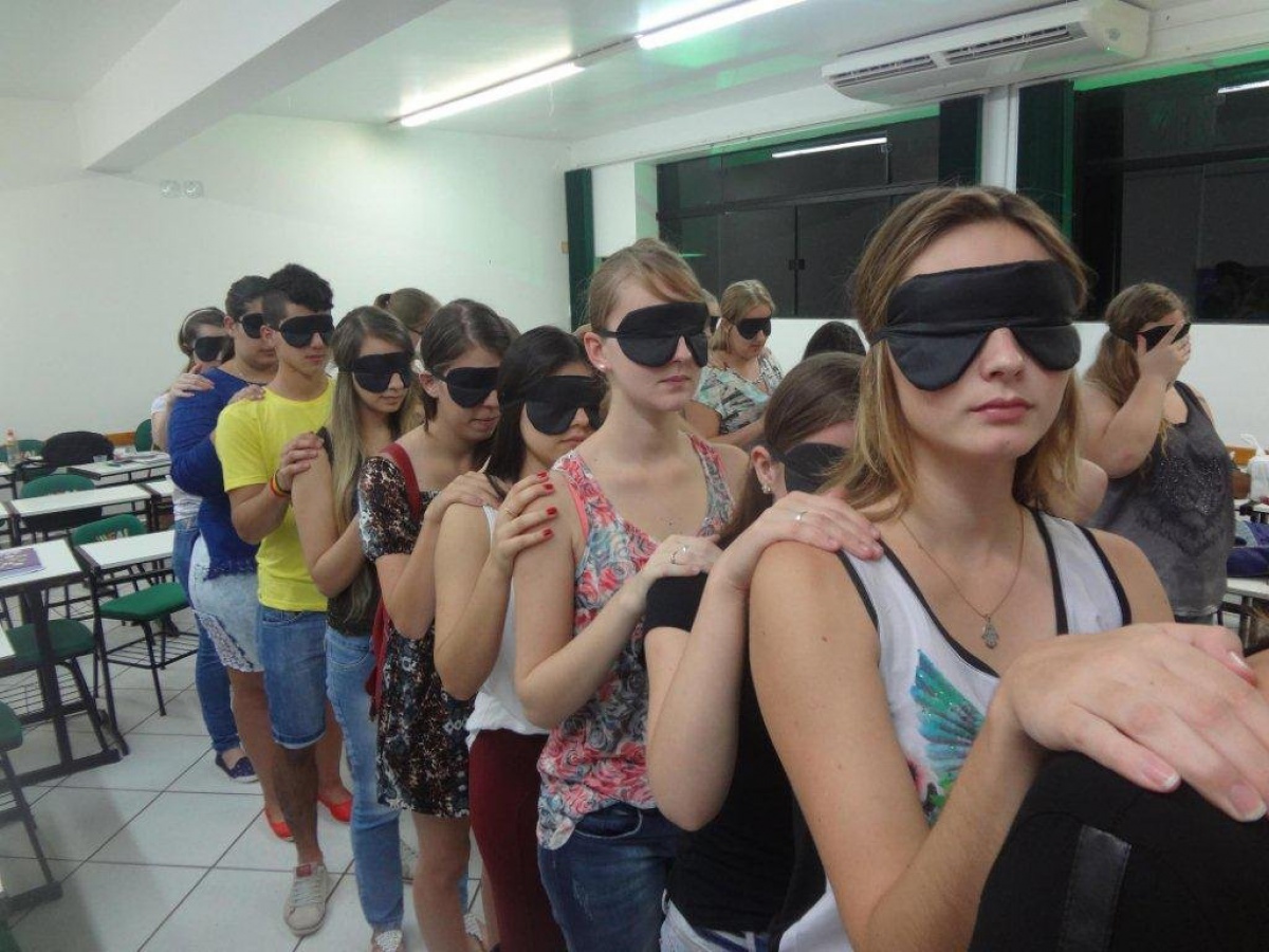 Os acadêmicos tiveram seus olhos vendados e foram conduzidos para a sala 31 do Bloco A, cujo espaço é específico para o desencadeamento da atividade. Quando chegaram à sala, foram acomodados e, ainda vendados, ouviram a interpretação do conto. Depois, puderam tirar a venda e assistir a um pequeno vídeo sobre a importância de ser águia e galinha. Esse vídeo gerou discussões entre os acadêmicos e as professoras Maria e Otília que conduziram o trabalho com indagações e comentários sobre o tema do conto. A aula transcorreu de forma agradável, os acadêmicos conseguiram entender a essência do conto e apresentaram relações entre a atualidade e a história do conto. A noite foi profícua, com a convalidação do trabalho e os acadêmicos demonstraram uma satisfação muito grande em participar de um trabalho interdisciplinar diferenciado.