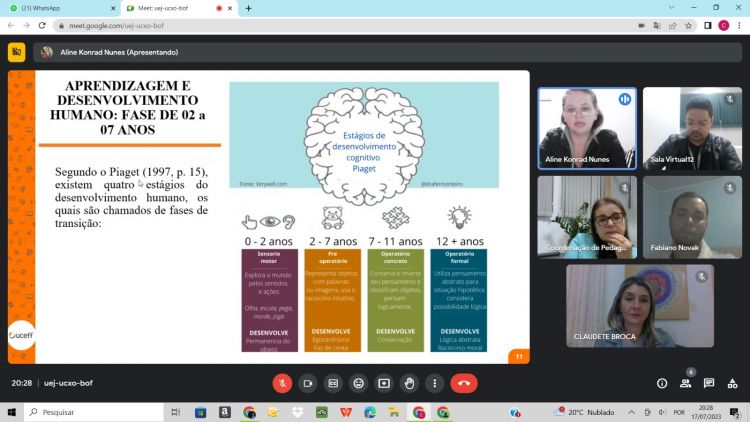 No dia 17 de julho, de forma virtual, aconteceu a socialização das experiências vivenciadas no Estágio Supervisionado II: Anos Iniciais, do curso de Pedagogia na modalidade EAD. Participaram da banca avaliadora os professores Claudete Broca (orientadora do estágio), Matheus Cardoso da Silva (monitor do curso) e Maria Preis Welter (coordenadora do curso)