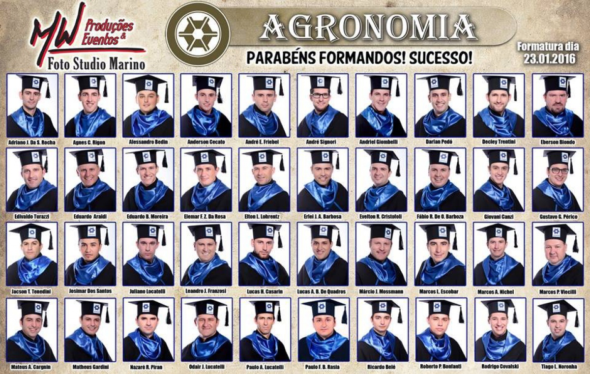 No sábado (23/1) os acadêmicos concluintes do curso de Agronomia da FAI Faculdades fizeram grande festa na cerimônia de formatura. O evento teve início às 19 horas no Complexo Oktober de Itapiranga com a colação de grau, seguida da jantar e baile animado pela Banda América. A cerimônia foi conduzida pela Diretora de Ensino da FAI, Lenir Luft Schmitz, e acompanhada pelo coordenador do curso de Agronomia e professor homenageado, Anderson Rhoden; o patrono da turma, professor Marciano Balbinot; a paraninfa da turma, professora Fabiana Mühl; o professor homenageado, Neuri Feldmann; e o representante do Crea-SC, Engenheiro Maciel Welter.