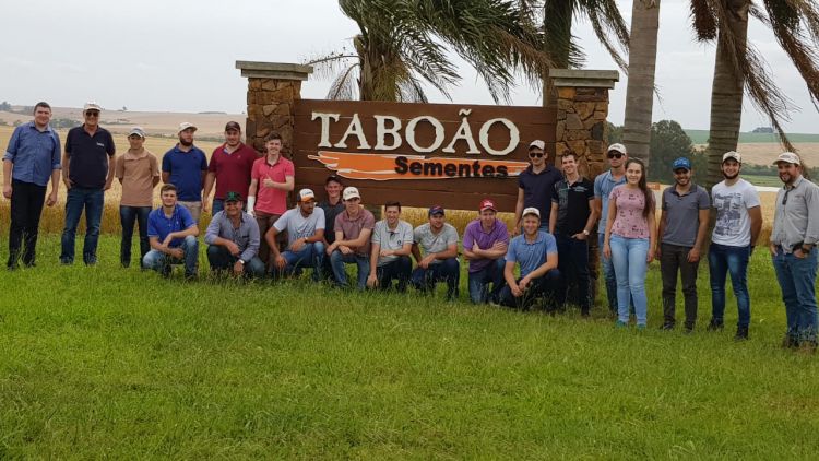 Já na parte da tarde ocorreu a visita técnica a Empresa Taboão Sementes, de propriedade do senhor Sérgio D. Ferreira e filhos, onde o mesmo acompanhou o grupo contribuindo com o conhecimento dos acadêmicos. Inicialmente o agrônomo responsável pelo trabalho na empresa, Me. Tiago Webber, apresentou toda estrutura interna que conta com mais de 10.000 m² de galpão para armazenamento de sementes, bem como os silos, e as máquinas de processamento e tratamento de sementes.