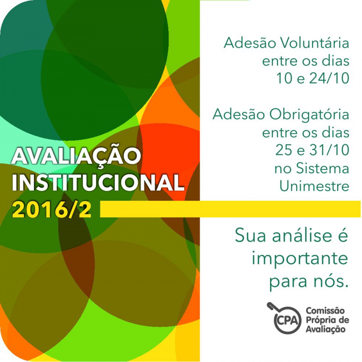 De acordo com o coordenador da Comissão Própria de Avaliação (CPA), professor Diego Albrecht, a medida tem gerado uma maior participação da comunidade acadêmica nos processos avaliativos e, consequentemente, uma visão mais completa e precisa da situação institucional. Ainda segundo o coordenador, neste semestre serão avaliados os desempenhos docente e discente, a organização e gestão e a sustentabilidade financeira.