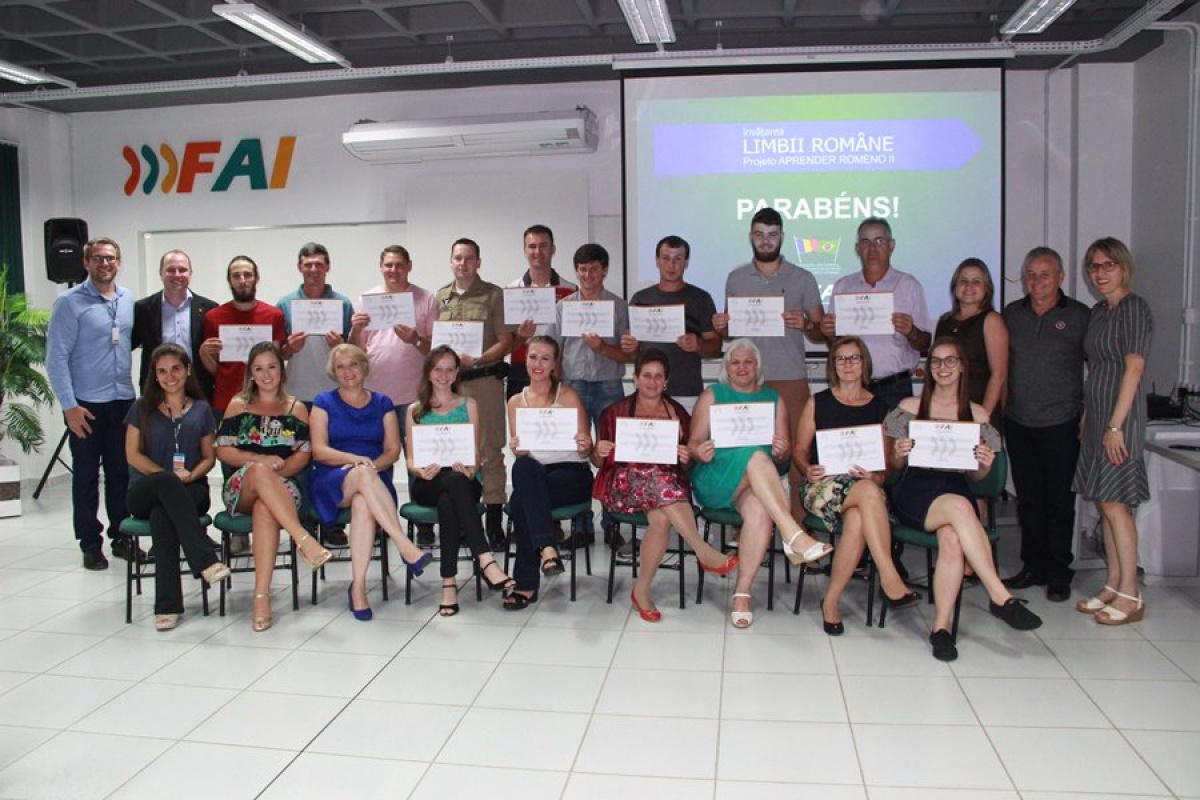 Nesta segunda-feira (18/12) o Centro Universitário FAI fez a entrega dos certificados para a 2ª turma do curso Aprender Romeno. O curso, oferecido na Instituição, contou com a parceria da Associação dos Romenos Bessarabianos do Extremo Oeste de Santa Catarina. De acordo com o coordenador das Atividades de Extensão, professor Kurlan Frey, o curso básico de Língua Romena teve duração de 60 horas e foi conduzido pela professora Florentina Muller Grulke.