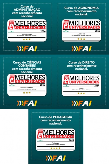 A FAI Faculdades teve, neste ano, os cursos de Administração, Agronomia, Ciências Contábeis, Direito e Pedagogia estrelados na avaliação de cursos superiores realizada pelo Guia do Estudante (GE) da editora Abril. Os cursos de Administração, Agronomia, Ciências Contábeis e Direito receberam o selo 3 Estrelas e Pedagogia o selo 4 Estrelas. Todos foram avaliados e atenderam a quatro critérios: ter a titulação de bacharelado ou licenciatura; possuir turma formada há pelo menos um ano; ter turmas em andamento e ser oferecido no próximo processo seletivo, além de ser um curso presencial.