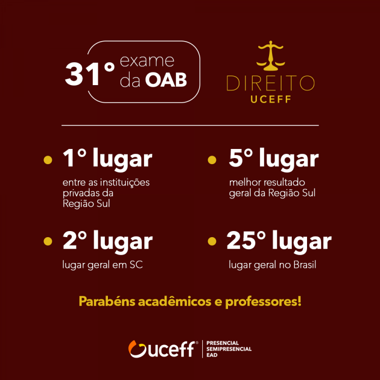 O coordenador do curso, professor Rogério Cézar Soehn, destaca que esse foi o melhor resultado alcançado nos últimos dez Exames de Ordem e coroa uma sequência ascendente de excelentes resultados, como no XXX Exame, quando a UCEFF também obteve a segunda colocação, porém à frente da Universidade Federal.