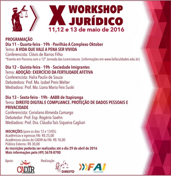 Conforme as coordenadoras do evento, professoras Cláudia Taís e Liana Maria, o Workshop Jurídico é dirigido a docentes e discentes do curso de Direito da FAI e de outras instituições, advogados e comunidade em geral.