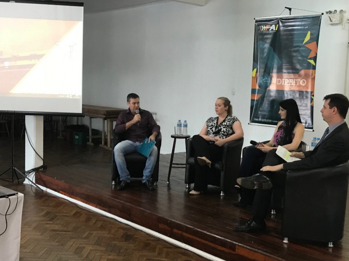 No dia 1º de dezembro, o curso de Direito do Centro Universitário FAI promoveu a segunda edição da atividade Profissões Jurídicas. O evento ocorreu na Associação Atlética Banco do Brasil AABB e contou com a presença da Advogada Ana Cristina Zanatta, formada na primeira turma do Curso de Direito da FAI, da Procuradora Jurídica do Município de Itapiranga, Advogada Fabrícia Kroetz, e do Promotor de Justiça da Comarca de Itapiranga, Marciano Villa, os quais foram os respectivos debatedores.