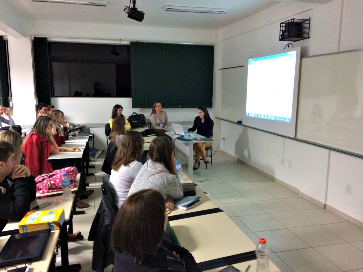 A acadêmica do 10º semestre, servidora do Tribunal de Justiça de Santa Catarina, Edivane Silvia Piovesan, e a advogada egressa da instituição, Ana Cristina Zanatta, apresentaram aos acadêmicos sua experiência prática com o processo eletrônico, demonstrando o caminho que é percorrido desde o peticionamento no escritório do advogado até o recebimento e cadastramento das peças que ocorre na distribuição dos cartórios judiciais.