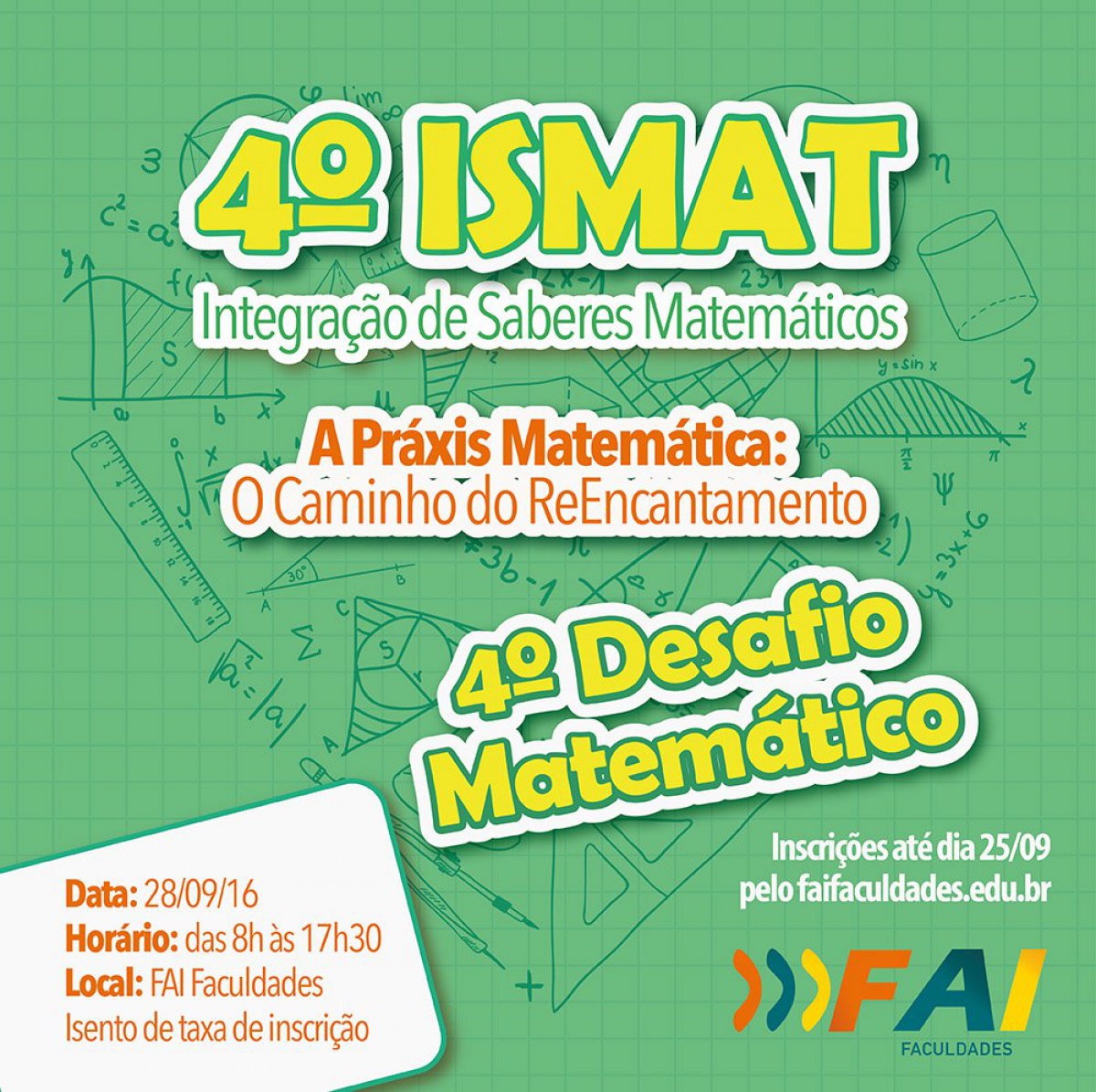 O curso de Licenciatura em Matemática da FAI Faculdades está preparando para o dia 28 de setembro a 4ª edição do Ismat - Integração dos Saberes Matemáticos, com o tema A práxis da matemática - o caminho do reEncantamento.