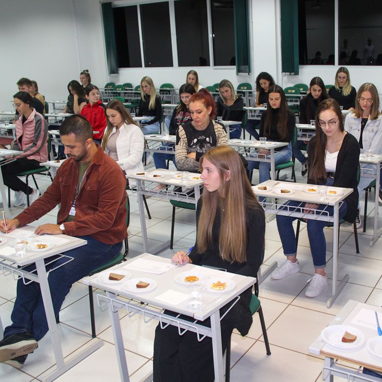 Os acadêmicos do 7º semestre de Nutrição foram desafiados pela professora Daiane Preci, na disciplina de Tecnologia de Alimentos e Análise Sensorial, a desenvolverem novos produtos de acordo com às novas tendências e necessidades de consumo. Eles convidaram alunos de diversos cursos para experimentar e avaliar as receitas desenvolvidas, atribuindo notas que irão medir a aceitação dos produtos desenvolvidos.