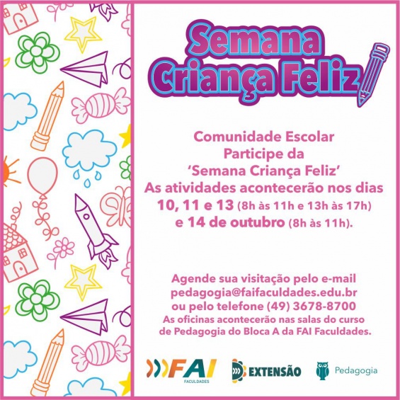 O curso de Pedagogia da FAI Faculdades está preparando para o mês de outubro a 3ª edição do Projeto Semana Criança Feliz\", nos dias 10,11,13 e 14 de outubro, com atividades lúdicas variadas, no intuito de proporcionar carinho, afeto e alegria em espaços acolhedores com atividades, brinquedos e brincadeiras que estimulem o desenvolvimento de habilidades e competências das crianças visitantes.
