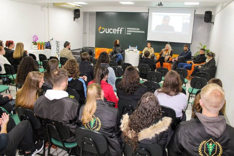 O evento que reuniu acadêmicos dos cursos de saúde teve como convidados o fisioterapeuta Erasmus Grings, a enfermeira Elaine Simonetti Zapanni, a psicóloga Elise Gretzler Trenhago, a nutricionista Ligia Prieto, o cirurgião dentista Renan Flach, a biomédica Taine Schneider e a esteticista Katerine Medino.
