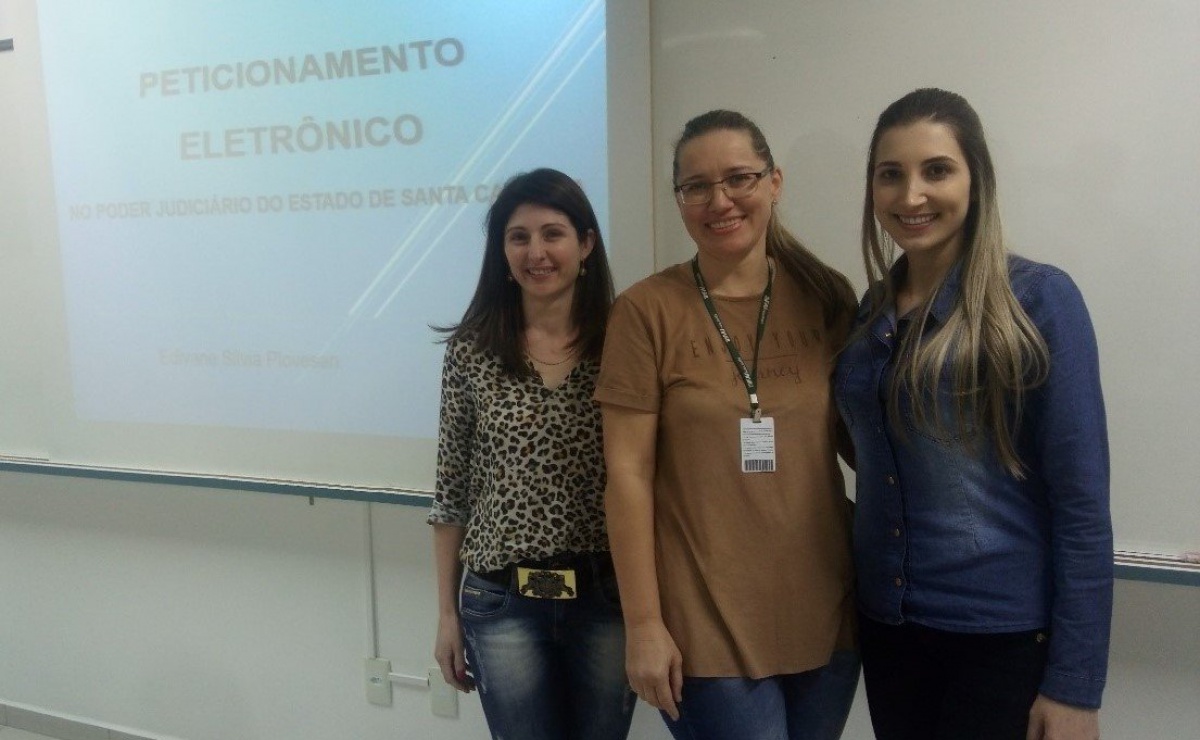 Andrea simulou o peticionamento de ações em três sistemas diversos: pelo e-SAJ, sistema utilizado pela Tribunal de Justiça de Santa Catarina, o PJe, da Justiça do Trabalho, e o e-Proc, da Justiça Federal, além de apresentar aos acadêmicos algumas ferramentas tecnológicas necessárias para que o advogado possa utilizar o processo eletrônico. O objetivo da oficina foi familiarizar os acadêmicos com a realidade do processo eletrônico e as mudanças que o novo sistema traz na prática para o exercício das atividades dos operadores do Direito.
