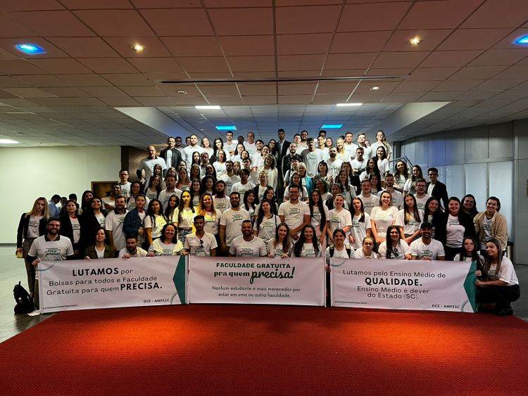 Composto por líderes estudantis, o grupo de aproximadamente 150 alunos debateu com deputados estaduais o programa Faculdade Gratuita, anunciado pelo governador Jorginho Mello e que propõe a compra de vagas no ensino superior catarinense pelo governo do estado, mas que beneficiarão somente um grupo de instituições que representa 30% do alunado matriculado em Santa Catarina.