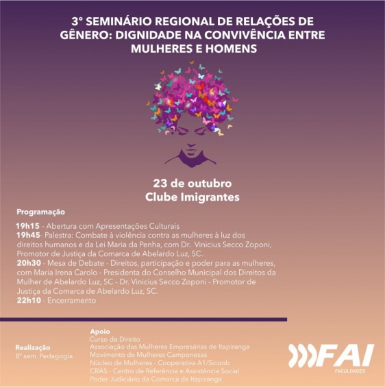 O 8º semestre do curso de Pedagogia da FAI Faculdades em conjunto com o curso de Direito e o Núcleo das Mulheres Empresárias de Itapiranga estão preparando para o dia 23 de outubro o 3º Seminário Regional de Relações de Gênero, este ano com a temática dignidade na convivência entre mulheres e homens. Conforme a professora Fátima Slevinski, o objetivo do evento é problematizar as relações de gênero, compreendendo que a família, a escola, a sociedade e o poder público têm um papel fundamental na luta contra os preconceitos e as discriminações de toda ordem e pela garantia de políticas para as mulheres.