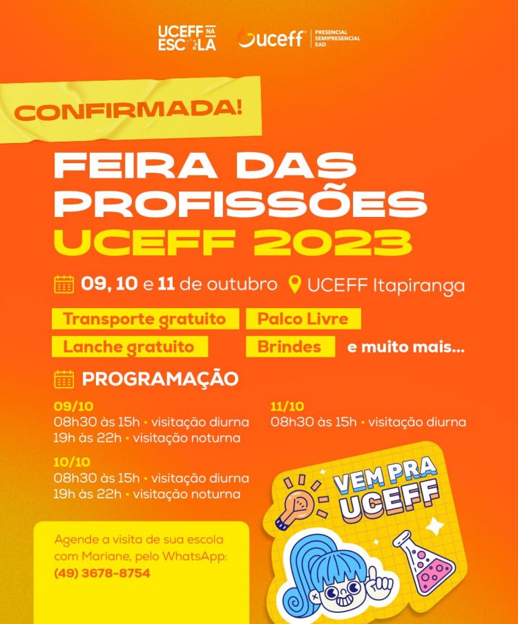 A UCEFF Itapiranga promove nos dias 9, 10 e 11 de outubro a tradicional Feira das Profissões, este ano em sua 13ª edição com o tema: "Sonhou em formar, vem para UCEFF realizar". Conforme o coordenador do programa UCEFF na Escola, professor Felipe Bozzetto, diversas novidades estão sendo preparadas para bem receber os alunos de 3º ano do Ensino Médio, além da imprensa, egressos e parceiros da Instituição e comunidade regional.