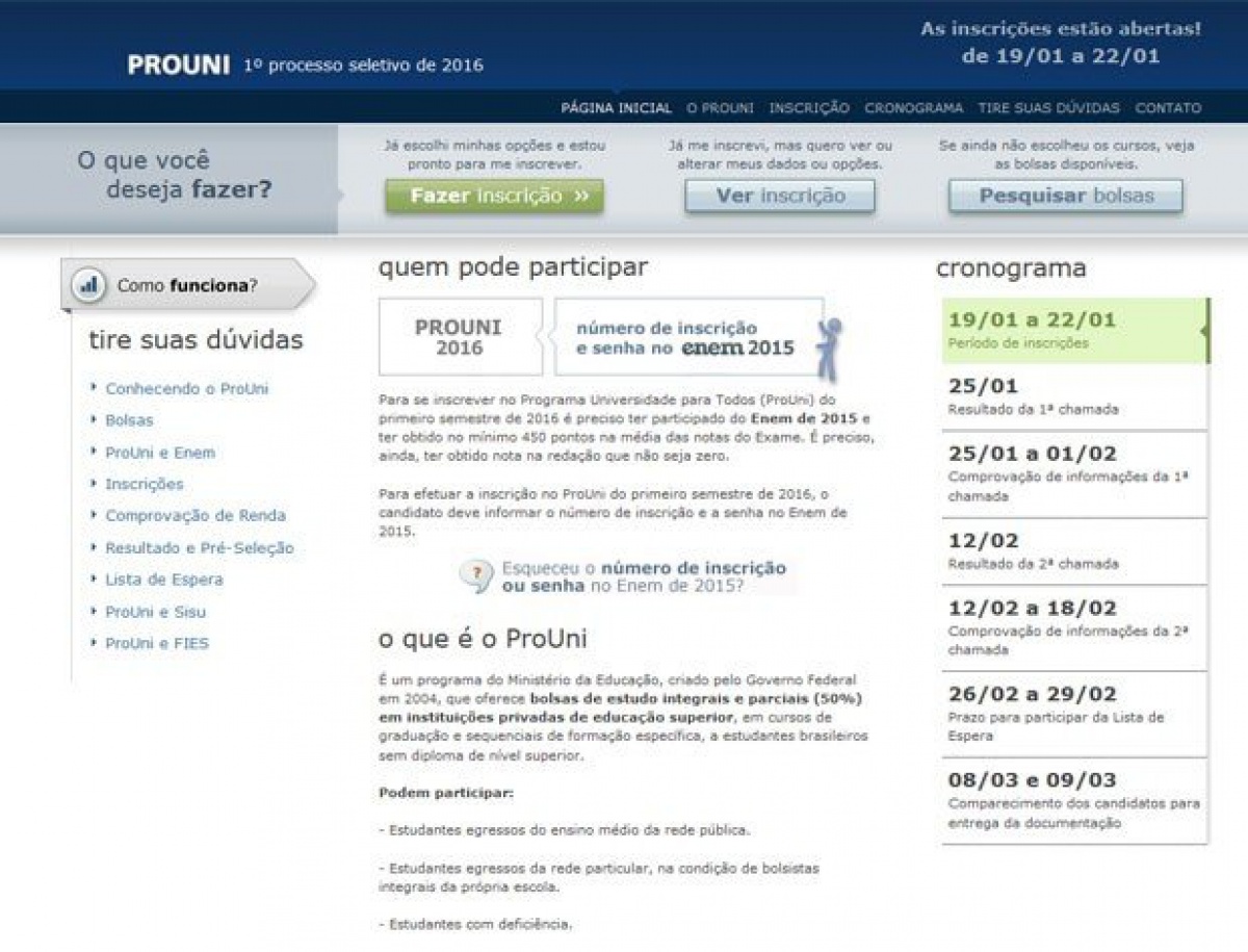 As inscrições no processo seletivo para bolsas de estudo na primeira edição de 2016 do Programa Universidade para Todos (Prouni) estão abertas. O prazo vai até as 23h59 de sexta-feira (22). A consulta das bolsas e as inscrições devem ser feitas pelo site http://siteprouni.mec.gov.br/.