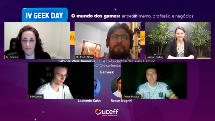 O mundo dos games foi o tema do 4º Geek Day promovido pelos cursos de tecnologia da UCEFF. Neste evento, totalmente online e gratuito, participaram os sócios proprietários da empresa desenvolvedora de jogos online, Caleta Gaming, Fabíola Jaeger e Paulo Nova, além dos gamers Renan Negrini e Leonardo Kuhn. A mediação da atividade foi da coordenadora dos cursos de TI, professora Juliane Colling. Participaram do evento acadêmicos, professores e coordenadores dos cursos de tecnologia e de gestão da UCEFF, além de diversas pessoas da comunidade externa interessadas no tema.
