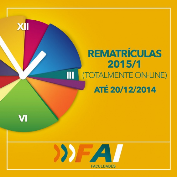 Seguem até sábado, dia 20 de dezembro, as rematrículas para todos os cursos da FAI Faculdades. Para realizar a rematrícula os acadêmicos, regularmente matriculados nos cursos da Instituição e sem débitos, devem acessar o site www.faifaculdades.edu.br, no Acesso Online, e em seguida no menu rematrícula. Já os alunos em débito devem procurar pelo setor financeiro para regularizar sua situação.