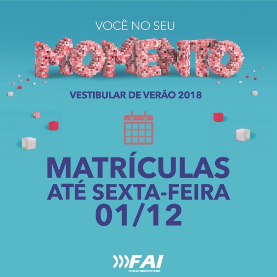 CLIQUE AQUI e confira a lista de aprovados no Vestibular. O Centro Universitário FAI concederá desconto de 30% na primeira parcela para os candidatos que realizarem a matrícula até sexta, 01/12.
