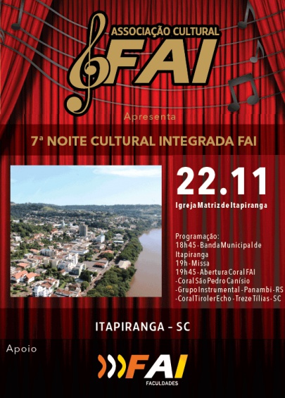 A Associação Cultural FAI irá promover no próximo dia 22 de novembro (sábado) a 7ª Noite Cultural Integrada na Igreja Matriz de Itapiranga.