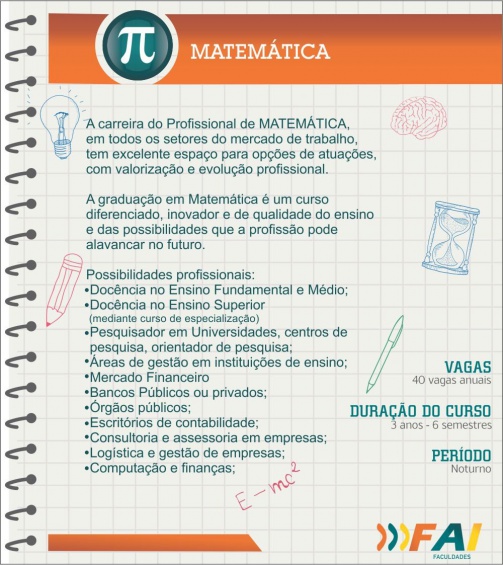 A carreira do profissional de Matemática em todos os setores do mercado de trabalho tem um espaço a ser trabalhado e valorizado. A graduação em Matemática, oferecida pela FAI Faculdades, é um curso diferenciado, inovador e de qualidade, no que se refere a qualidade do ensino e das possibilidades que posteriormente a profissão pode alavancar.