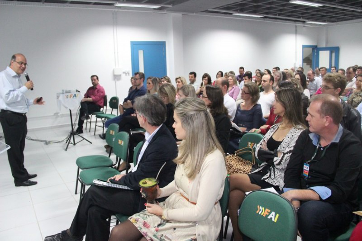 O Centro de Aperfeiçoamento Docente (CAD) promoveu no Auditório do Bloco C, nesta quarta-feira (5/8), palestra com o professor Dr. Cosme Massi sobre as Diretrizes do Enade e Aprendizagem Ativa. Conforme a Diretora de Ensino, Lenir Luft Schmitz, a FAI Faculdades oportuniza periodicamente através do CAD cursos e palestras de aperfeiçoamento para os seus professores.
