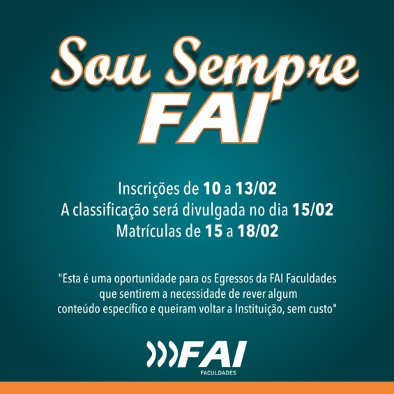 O Programa \"Sou Sempre FAI\" está com inscrições abertas para algumas disciplinas dos cursos de graduação até o dia 13 de fevereiro. Já a classificação será divulgada no dia 15 e as matrículas serão de 15 a 18 de fevereiro.