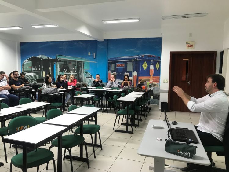 Bruno apresentou aos alunos as diferentes formas que existem para registrar o conhecimento intelectual produzido e sistematizado em forma de produtos que possam ser posteriormente comercializados, sejam eles marcas, patentes, softwares, design industrial, etc. O bate-papo foi bastante instigante e agregou novos conhecimentos sobre este tema relevante aos acadêmicos do curso de Administração.