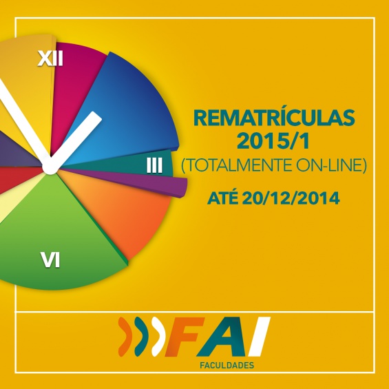 Segue até o dia 20 de dezembro, o período de rematrículas para todos os cursos da FAI Faculdades. Para realizar a rematrícula os acadêmicos, regularmente matriculados nos cursos da Instituição e sem débitos, devem acessar o site www.faifaculdades.edu.br, no Acesso Online, e em seguida no menu rematrícula. Já os alunos em débito devem procurar pelo setor financeiro para regularizar sua situação.