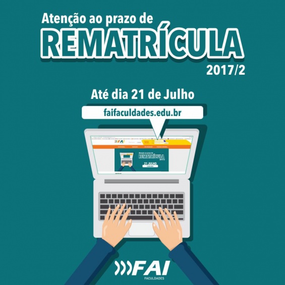 Segue até o dia 21 de julho o período de rematrículas para todos os cursos da FAI Faculdades. A mensalidade referente ao mês de julho equivale a rematrícula e deverá ser paga, através de boleto bancário nos bancos credenciados, para ativar a rematrícula.