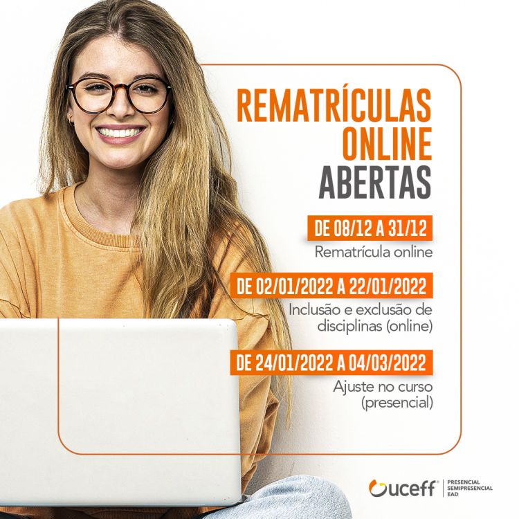 As rematrículas para o primeiro semestre letivo de 2022 na UCEFF já estão abertas. O prazo vai até o dia 31 de dezembro. Para realizar sua rematrícula, acesse o Portal do Aluno.